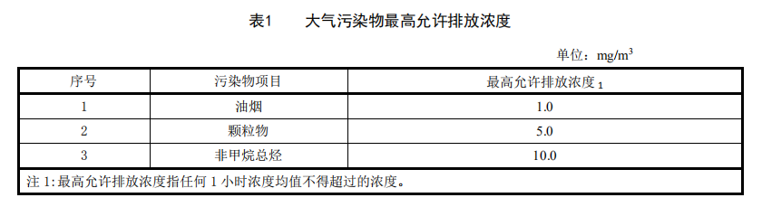 4.1.1 自本标准实施之日起,餐饮服务单位排放的油烟、颗粒物的最高允许排放浓度,应符合表 1 的规