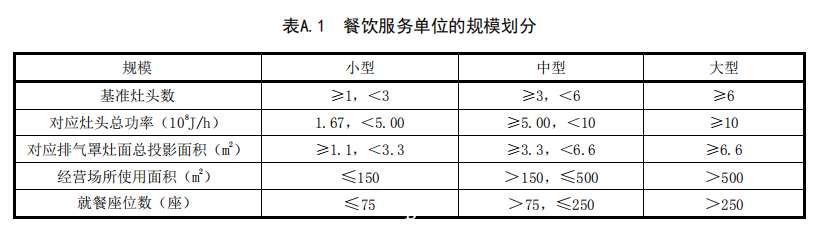 A.1 餐饮服务单位划分为大型、中型和小型三个规模。基准灶头数按灶的总发热功率或排气罩面投影