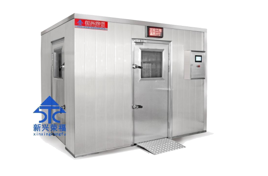 该消毒库采用热风循环系统将库内餐具均匀加热到要求温度,并在高温下保持一段时间后即可起到杀毒灭菌作用。消毒库加热源主要有电加热、燃气加热和蒸汽加热三种,均是通过散热器间接加热库内气体温度,从而保证了库内加热气体清洁无污染。