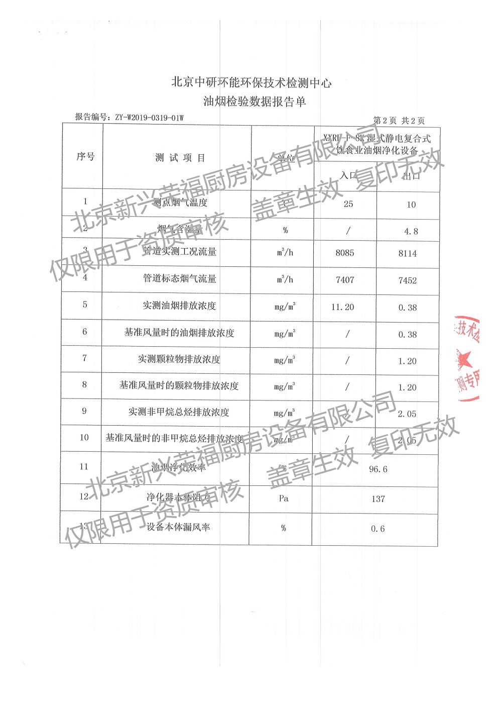1、净化率高达96%,优于DB11 1488北京地标-餐饮业大气污染物排放标准。经实际使用和第三方检测机构检测结果如下:油烟浓度:0.38mg/m³;颗粒物浓度:1.20mg/m³;非甲烷总烃浓度:2.05mg/m。