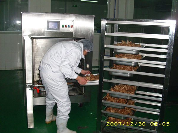2、用强冷风冷却(冷却隧道),时间可缩短,但中心温度仍下降缓慢,自然冷却的缺陷仍然存在,冷却不均匀导致食品外冷内热,大大降低了食品的风味。使用强冷风冷却的另一个很大缺陷就是能源消耗很大。真空冷却的迅速降温,阻止了食品因本身加工完毕后自身余热的作用造成的过度熟化,过度熟化会让食品失去本身的特殊香味。(例如,炒制的绿叶菜,如不经过20分钟内迅速的降温,那么它将会褐变,颜色不再鲜艳)